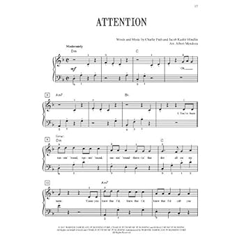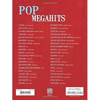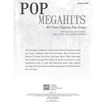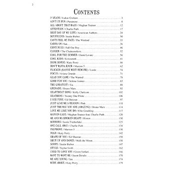 This jam-packed collection contains only the best of the best current pop songs, including smash hits from Bruno Mars, Charlie Puth, Maroon 5, Twenty One Pilots, and many others. These tunes have been carefully arranged for students at the late elementary to early intermediate level, so soon after beginning piano study students can enjoy these fun and accessible arrangements of the best-known music of today. Titles: 7 Years (Lukas Graham) * Ain't It Fun (Paramore) * All About That Bass (Meghan Trainor) * Attention (Charlie Puth) * Best Day of My Life (American Authors) * Boyfriend (Justin Bieber) * Can't Feel My Face (The Weeknd) * Carry On (fun.) * Centuries (Fall Out Boy) * Closer (The Chainsmokers) * Cool for the Summer (Demi Lovato) * Cool Kids (Echosmith) * Dark Horse (Katy Perry) * Don't Wanna Know (Maroon 5) * Flicker (Kanye West Remix) (Lorde) * Focus (Ariana Grande) * Glad You Came (The Wanted) * Good for You (Selena Gomez) * The Greatest (Sia) * Grenade (Bruno Mars) * Heartbeat Song (Kelly Clarkson) * Heathens (Twenty One Pilots) * I See Fire (Ed Sheeran) * Just Give Me a Reason (Pink) * Just the Way You Are (Amazing) (Bruno Mars) * Love Me Like You Do (Ellie Goulding) * Marvin Gaye (Meghan Trainor feat. Charlie Puth) * Me and My Broken Heart (Rixton) * Mirrors (Justin Timberlake) * One Call Away (Charlie Puth) * Payphone (Maroon 5) * Roar (Katy Perry) * Shape of You (Ed Sheeran) * Shut Up and Dance (Walk the Moon) * Sorry (Justin Bieber) * Style (Taylor Swift) * Used to Love You (Gwen Stefani) * Want to Want Me (Jason Derulo) * We Are Young (fun.) * Wide Awake (Katy Perry).
