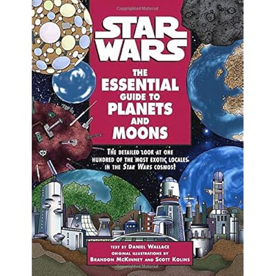 Amazon.com Review For the true Star Wars fan, the Essential Guide to Planets and Moons is crucial. You can keep track of all the places mentioned in the movies, books, and comics with this detailed reference. One hundred locations, from the well-known (Tatooine and Hoth) to the more obscure (J't'p'tan and Taanab), are covered in detail. Each planet, moon, or asteroid is accompanied by information on solar system, terrain, language, and points of interest, along with illustrations of the resident species, intelligent and otherwise. Daniel Wallace investigates each planet's role in the Star Wars saga, while Brandon McKinney and Scott Kolins's comic-style black-and-white drawings help the reader get an idea of what these unique worlds and their inhabitants look like. The Essential Guide series also includes Weapons and Technology, Vehicles and Vessels, and Characters. Read more From the Inside Flap RESOURCE TO THE WORLDS OF THE STAR WARS GALAXY!From the sun-baked deserts of Tatooine to the frost-bitten snowscape of Hoth to the misty swamps of Dagobah, here's your expert guide to the hundred most fascinating worlds of the extraordinary Star Wars universe. Travel from the Deep Core to the Outer Rim Territories and discover the wonders of: ¸ Kashyyyk--the treacherous, arboreal planet where the Wookiee race dwells among the branches in elevated cities . . . and lethal predators rule the surface ¸ Bespin--the gas planet devoid of solid ground, in whose atmosphere hovers the formidable Cloud City ¸ Endor--The Forest Moon: home to the peaceful but powerful Ewoks and site of a decisive battle in the galactic civil war ¸ Coruscant--center of power, law, history, and culture in the galaxy . . . and once the location of Imperial City, the seat of the dreaded EmpireEXPLORE THE TERR Read more See all Editorial Reviews